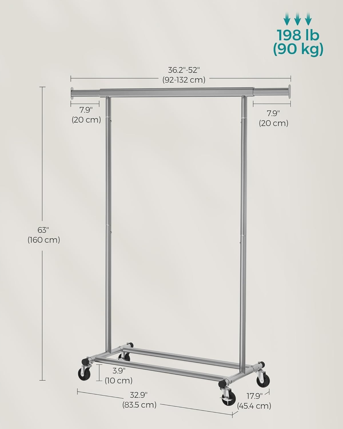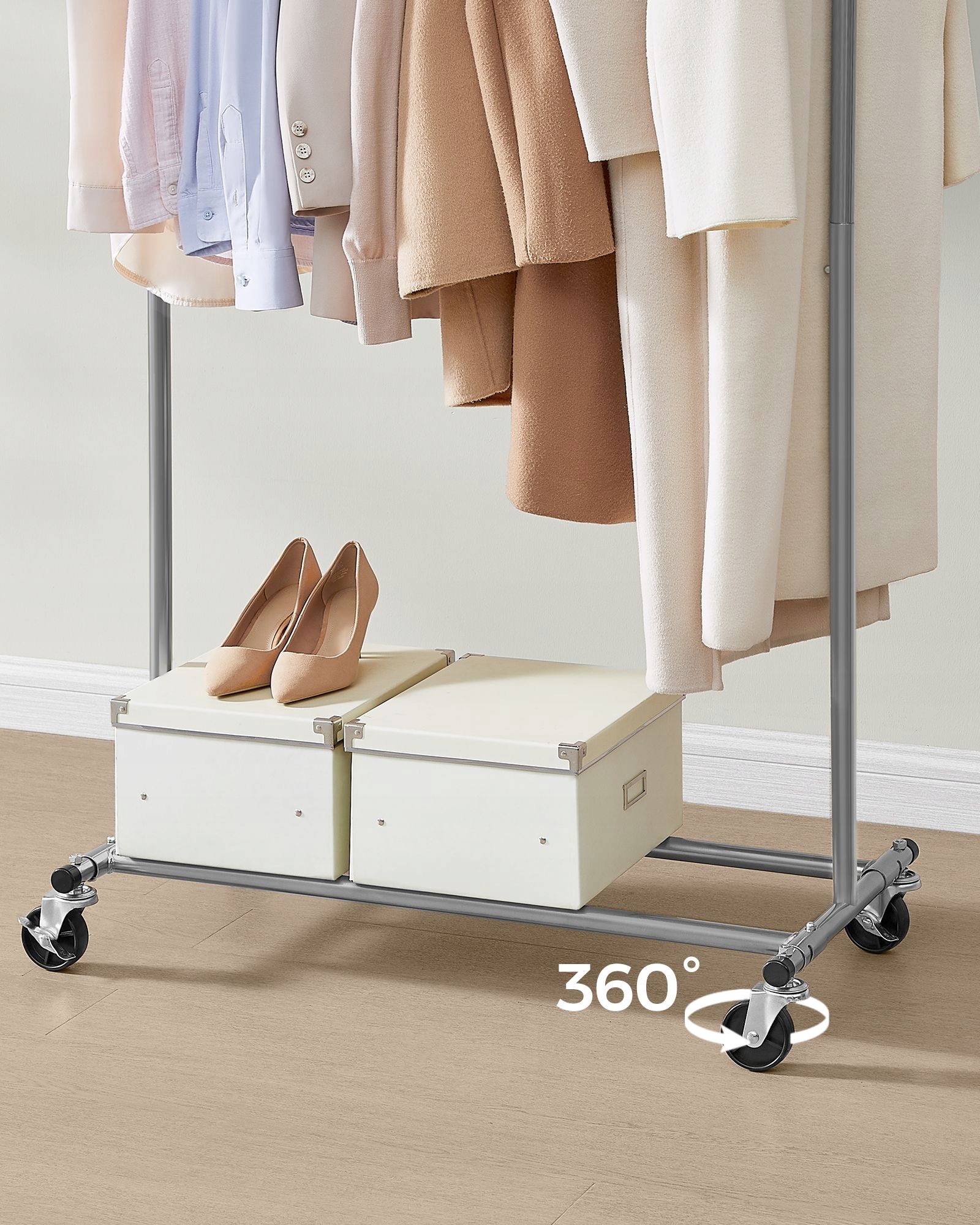 Wieszak na ubrania na kółkach, mobilny wieszak na ubrania, wysuwany drążek, nośność do 90 kg, łatwy w montażu, przenośny, gołębi szary