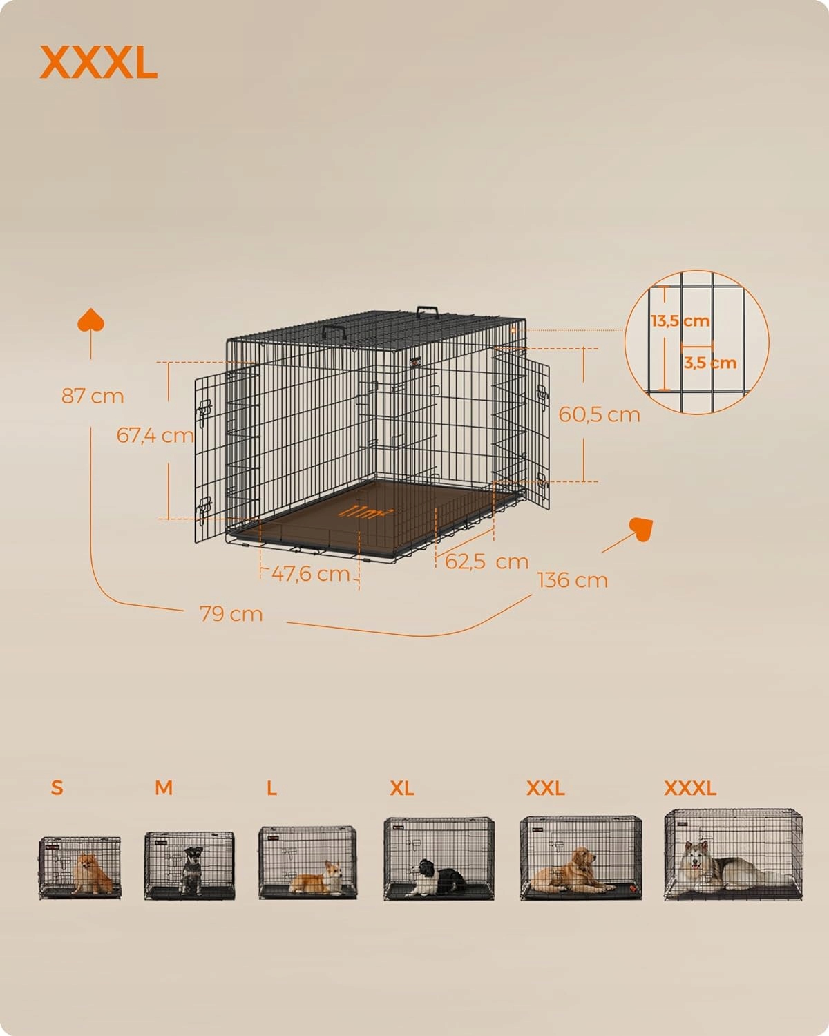 - Określ właściwy rozmiar: Klatka dla psa o wymiarach 136 x 79 x 87 cm jest odpowiednia dla psów o wadze od 50 do 68 kg. Zalecane rasy: Pireneje Wielkie, Bernardyn, Nowa Fundlandia itp. Postępuj zgodnie z instrukcjami dotyczącymi prawidłowej metody pomiaru