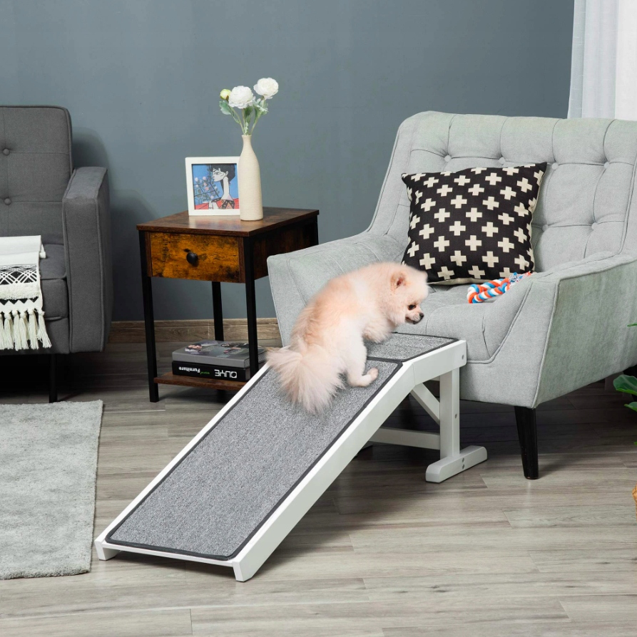 Chroń swojego psa przed obrażeniami dzięki rampie dla zwierząt z drewna sosnowego. Rampa dla psów umożliwia starszym i małym psom, a także psom mającym problemy z poruszaniem się, dotarcie i zejście z miejsc takich jak kanapa i łóżko. Antypoślizgowa powierzchnia pomaga Twojemu zwierzakowi bezpiecznie się wspinać, a platforma na górze pozwala mu odpocząć. Wykończenie z drewna wiśniowego i szary dywan pasują do niemal każdego wnętrza domu.