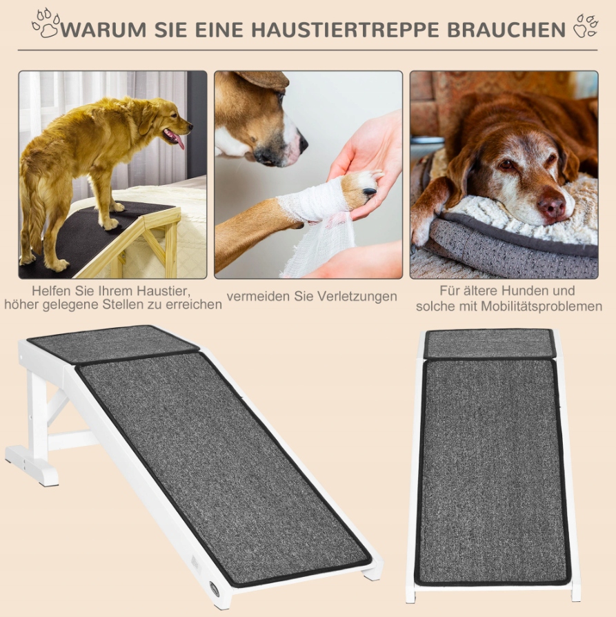 - Nadaje się dla starszych i małych psów oraz psów o ograniczonej sprawności ruchowej, aby zapewnić im delikatny kąt do wsiadania i wysiadania. - Wykonane z wysokiej jakości drewna sosnowego, zapewniającego długotrwałe użytkowanie. - Antypoślizgowy dywan na rampie zapewnia Twojemu psu bezpieczeństwo, a platforma na górze zapewnia mu miejsce do odpoczynku i spędzania czasu. - Drewno sosnowe i szary dywan tworzą nowoczesny design