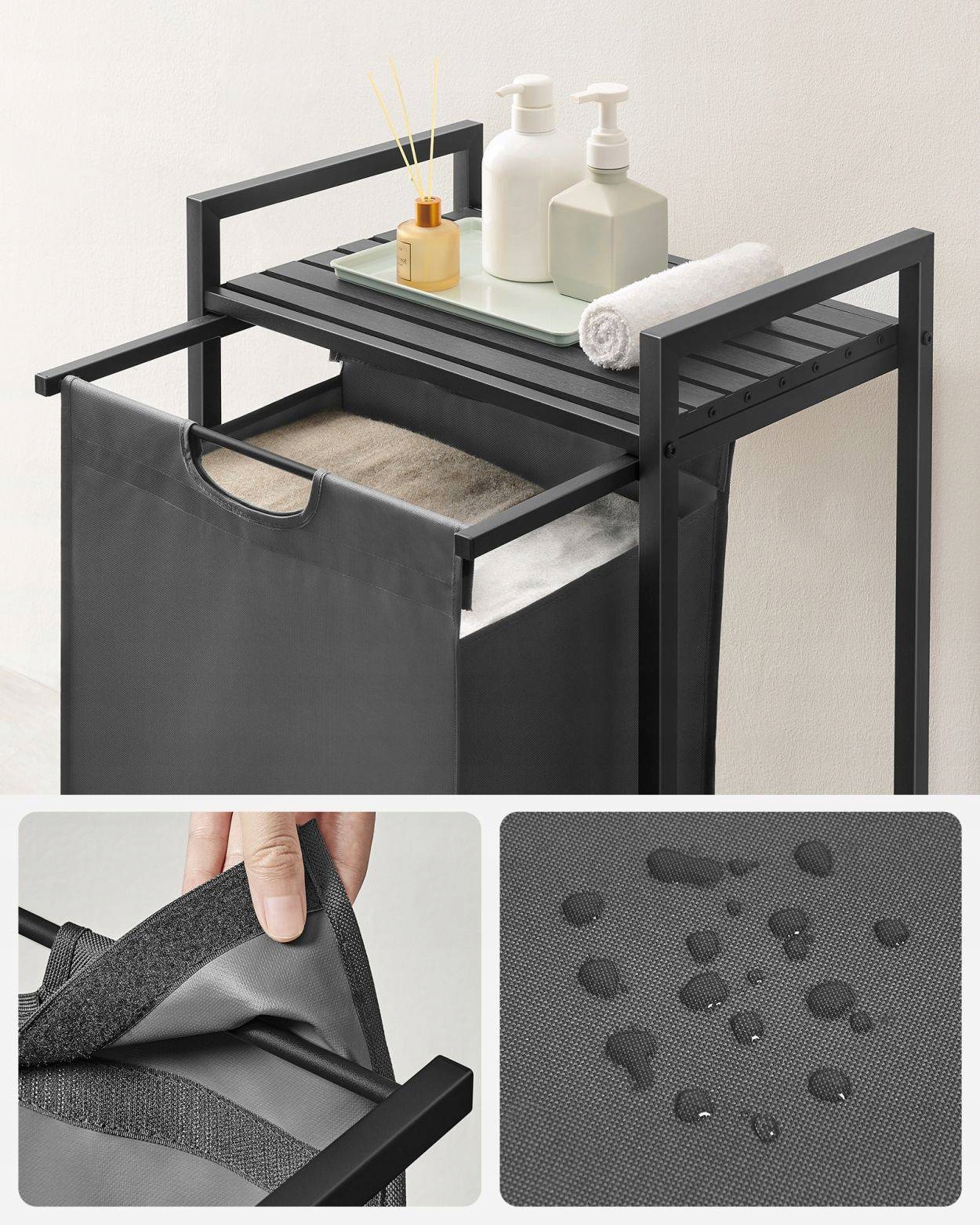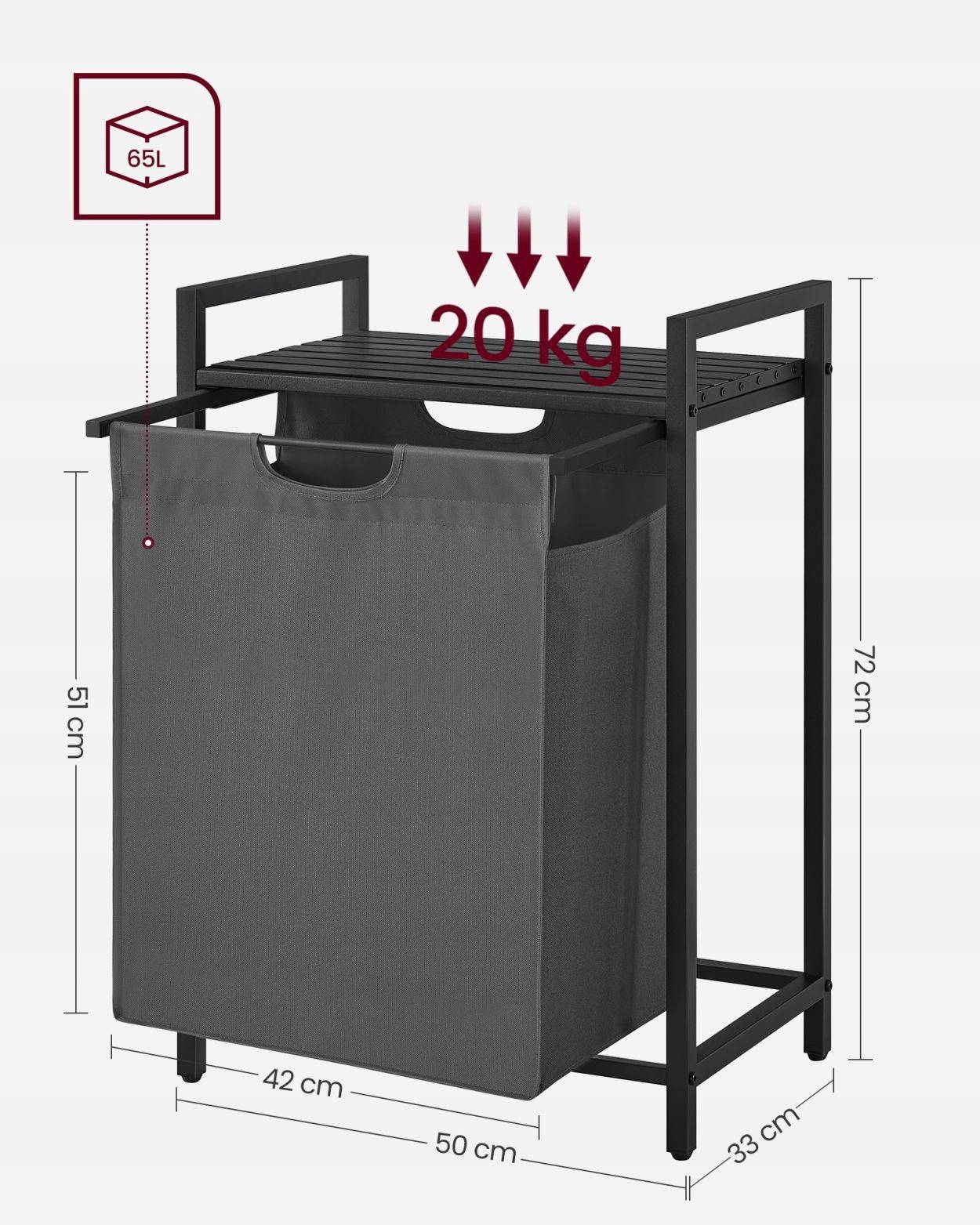 Kosz na pranie, pojemnik na pranie z półką, torba na pranie wykonana z tkaniny Oxford, wyjmowana, metalowa rama, 65 L, 50 x 33 x 72 cm, czarno-szary