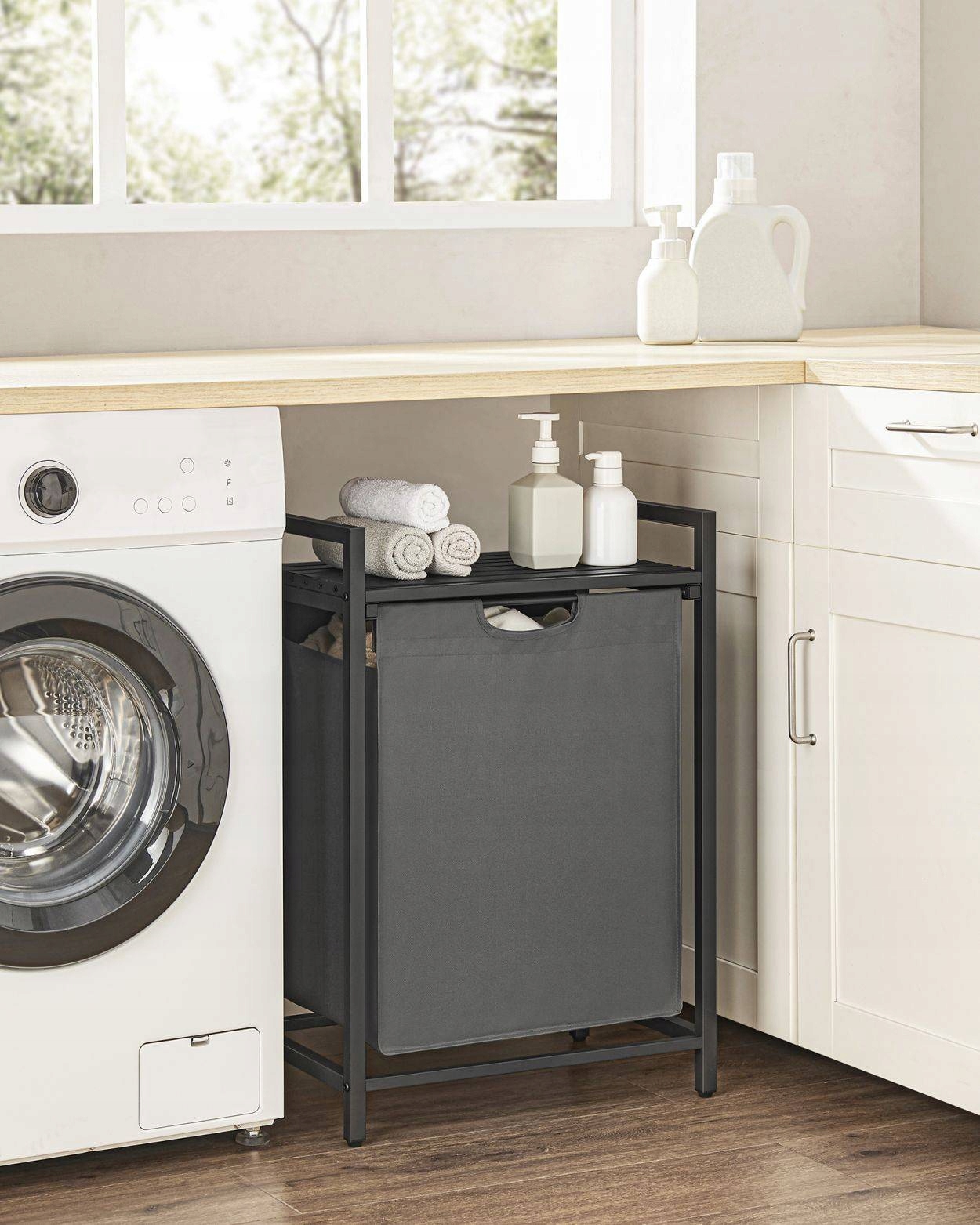 - Z półką: Półka na kosz na bieliznę zapewnia dodatkowe miejsce na detergent lub przybory toaletowe; lamelkowa konstrukcja zapewnia optymalną cyrkulację powietrza, zapobiegając powstawaniu niepożądanych zapachów