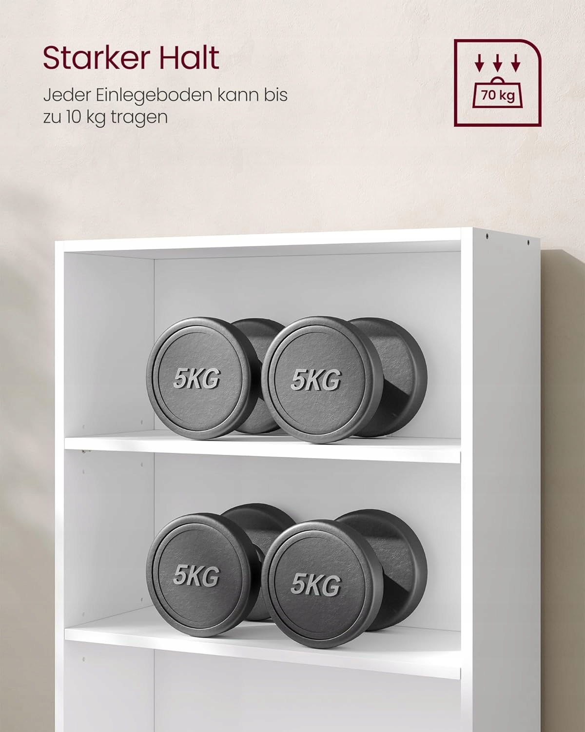 - [Regulowane półki] Poza środkową półką, pozostałe można regulować w 3 pozycjach wysokości (w górę lub w dół o 3 cm), dzięki czemu odstęp między półkami można regulować w zakresie 22,1–27,9 cm, dzięki czemu na tej półce z łatwością zmieszczą się wysokie książki, dzieła sztuki lub pudełka do przechowywania