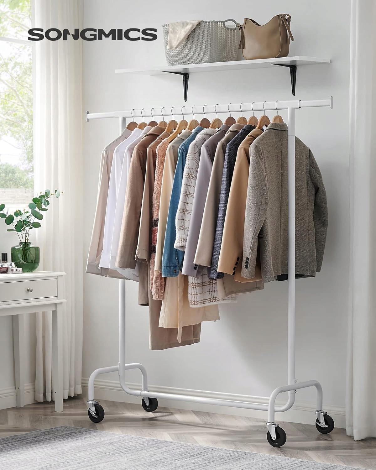 - Wysuwany drążek na ubrania: Długość drążka na ubrania można regulować o 20 cm na każdym końcu (długość drążka na ubrania: 110-150 cm), co zapewnia więcej miejsca do wieszania; torby, kapelusze, szaliki i inne akcesoria mieszczą się na bocznych szynach.