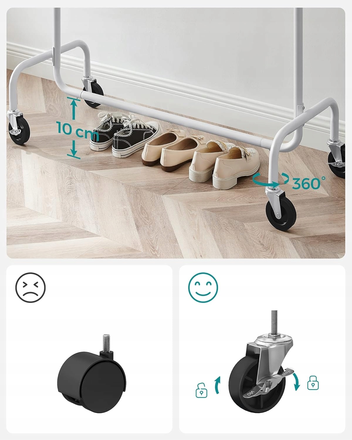 - Zwiększona nośność: Rury stalowe o grubości ścianki 1 mm, które są bardziej wytrzymałe niż te o grubości ścianki 0,8 mm, kółka przemysłowe PP o wysokiej wytrzymałości - ten wieszak na płaszcze wytrzymuje obciążenie do 136 kg. Można stabilnie powiesić płaszcze i kurtki!